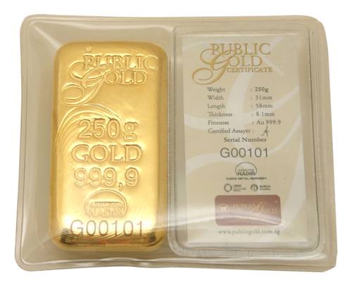 Gold bar 5 gram Public Gold. Setiap keping emas disertakan sijil ketulenan yang disahkan oleh assayer bebas. Bagi emas LBMA, sijil ketulenan dilekatkan terus pada bahagian belakang emas.
