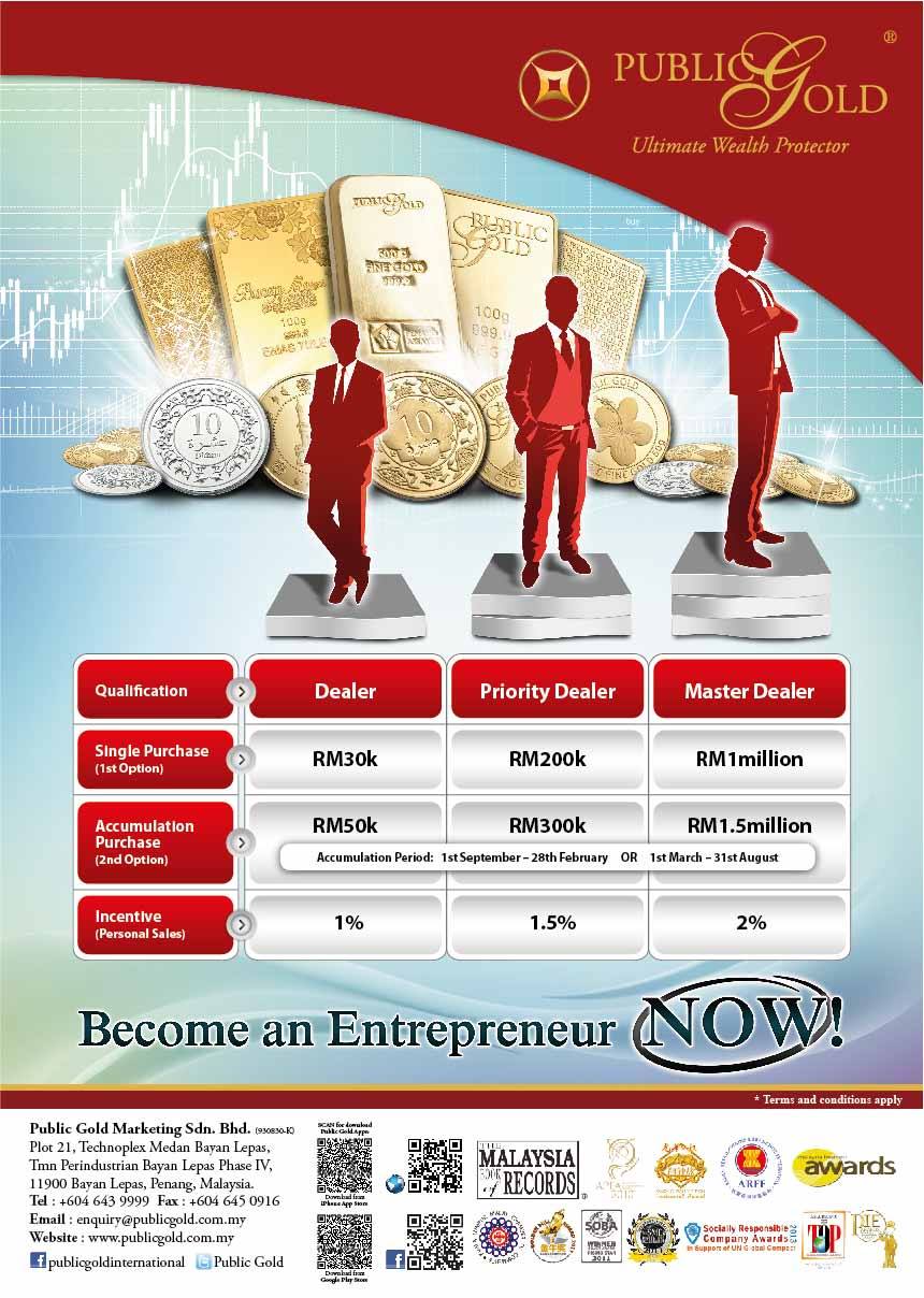 Kaedah ketiga ni paling senang. Jadi dealer Public Gold dengan buat belian emas bernilai RM30,000 dalam 1 resit. Pastikan pembelian tu dibuat melalui dealer (introducer) yang komited dan boleh bagi bimbingan yang betul supaya kita boleh belajar dari dia (sebagai mentor). Lepas tu bagi kesedaran kepada orang ramai tentang kepentingan simpan emas dan ajar mereka pelaburan emas yang betul.