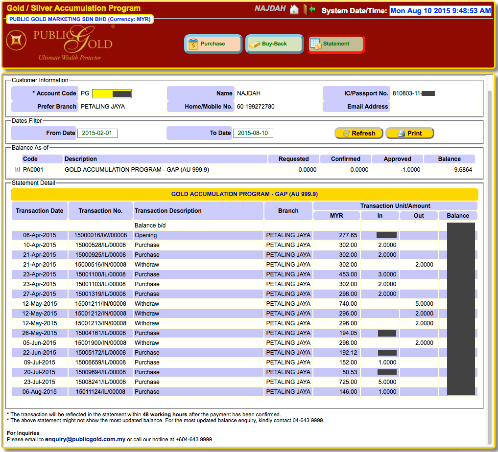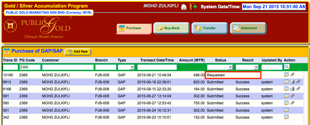 Kalau dah "Success", maklumat belian akan keluar dalam Web GAP Statement begini. Kalau lepas 2 hari bekerja masih belum update dalam statement, contact cawangan Public Gold terdekat untuk mereka buat semakan.