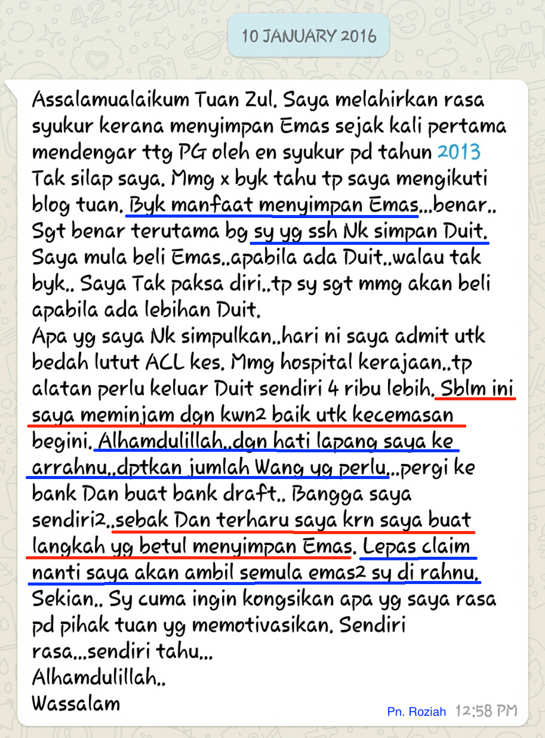 emas sebagai dana kecemasanEmas boleh berfungsi sebagai alat menutup kebocoran wang sekaligus sebagai dana kecemasan. Bila nak pakai duit, boleh jual atau pajak sahaja untuk dapat tunai segera sebagaimana kes Pn. Roziah ini.