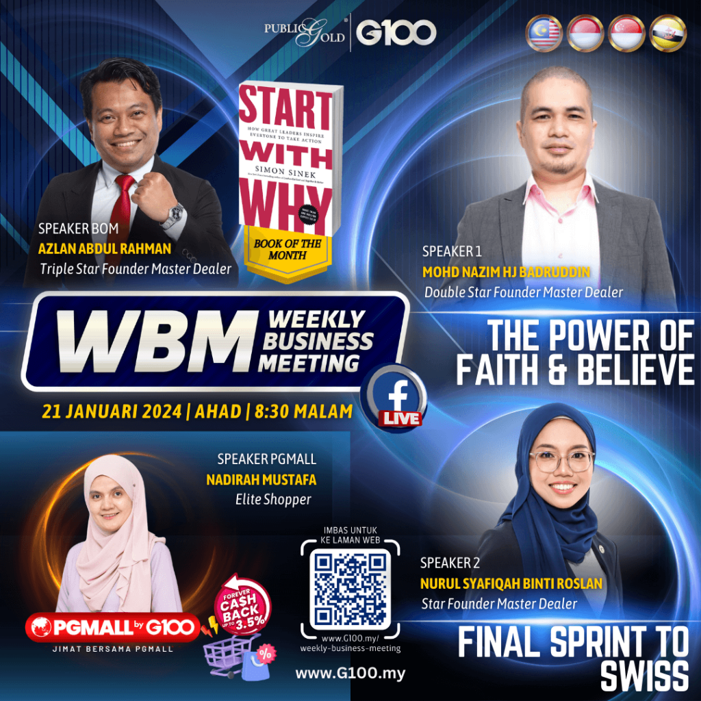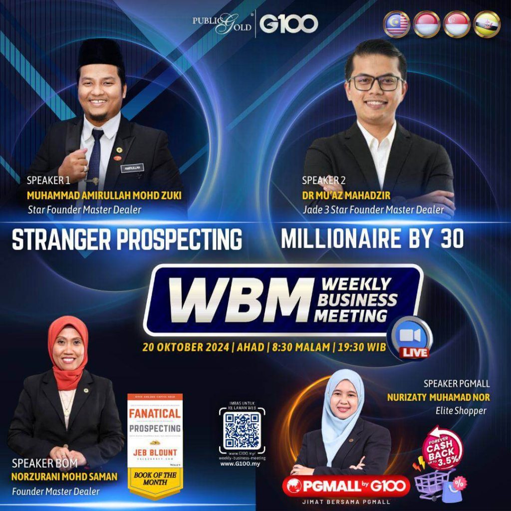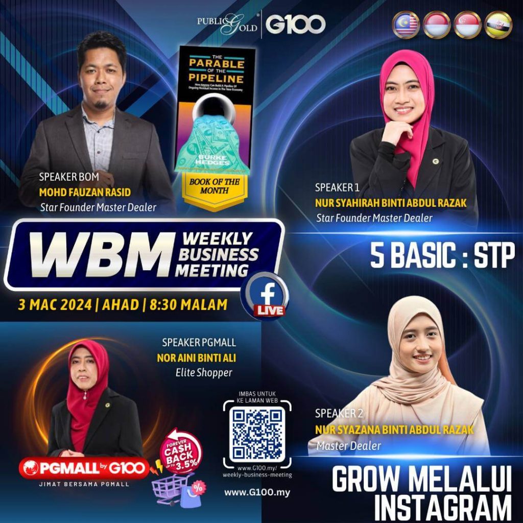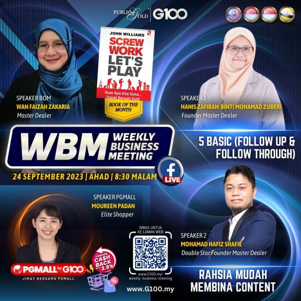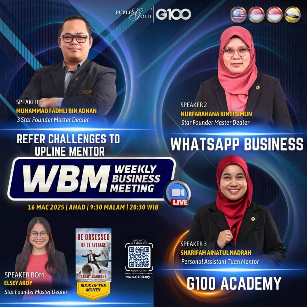Peluang dapatkan input terkini, associate sesama team G100 yang positif, dan rungkaikan sebarang persoalan tentang bisnes setiap minggu supaya sentiasa bermotivasi.