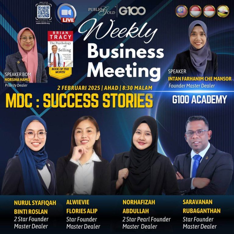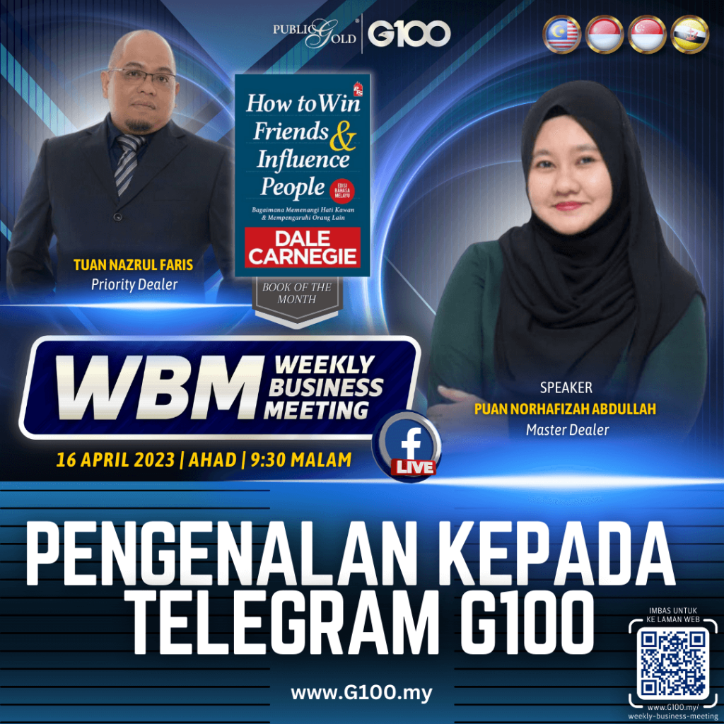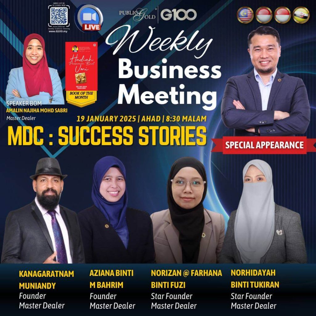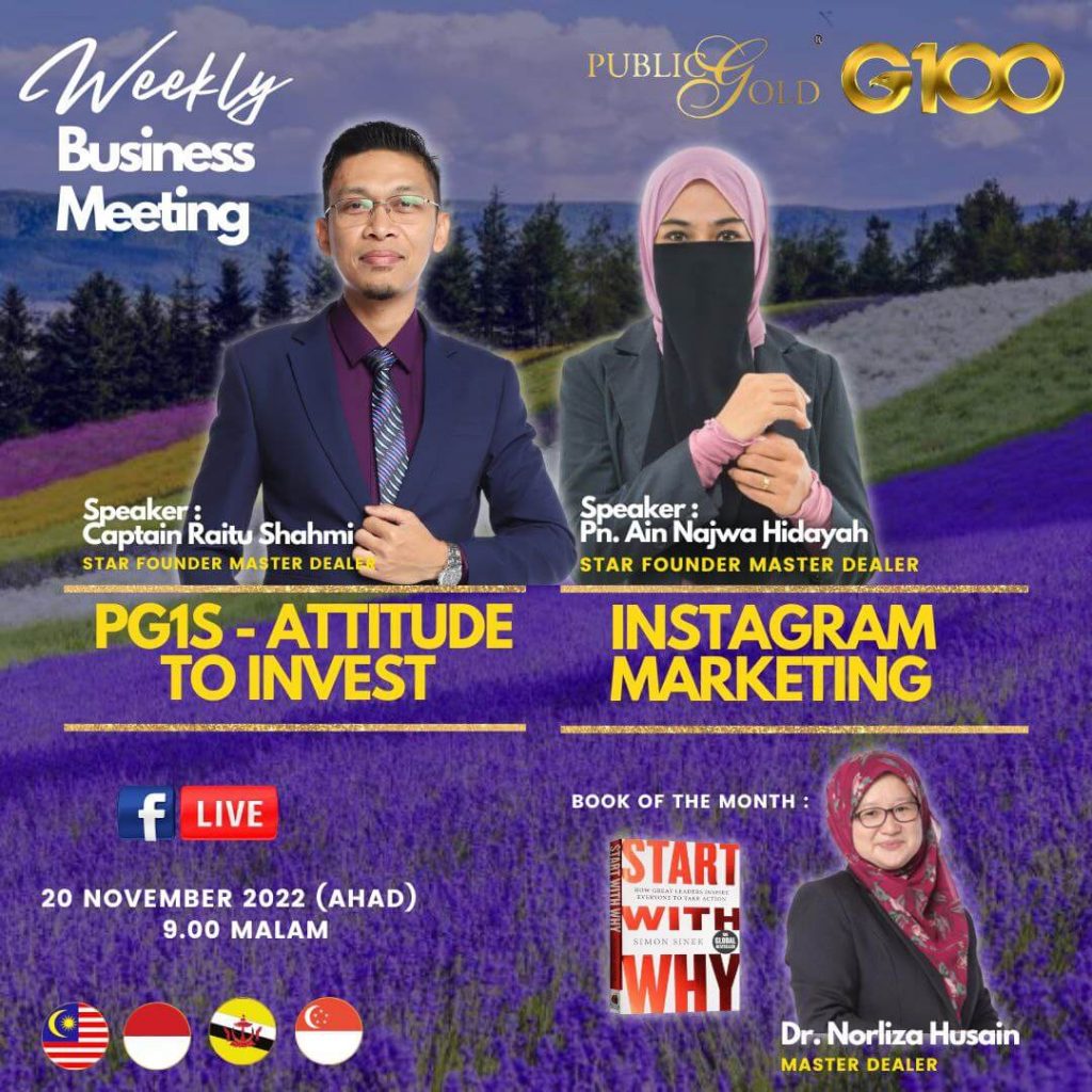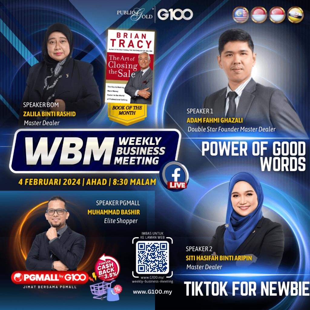 Peluang dapatkan input terkini, associate sesama team G100 yang positif, dan rungkaikan sebarang persoalan tentang bisnes setiap minggu supaya sentiasa bermotivasi.