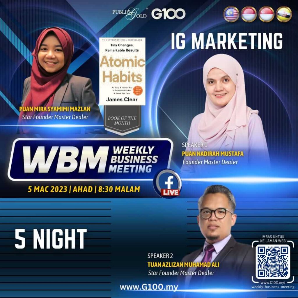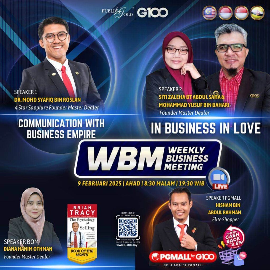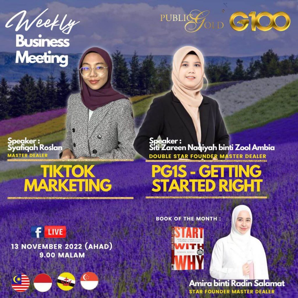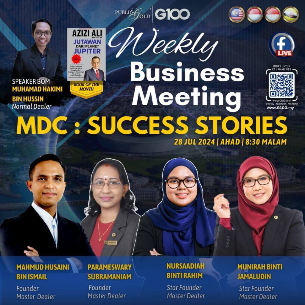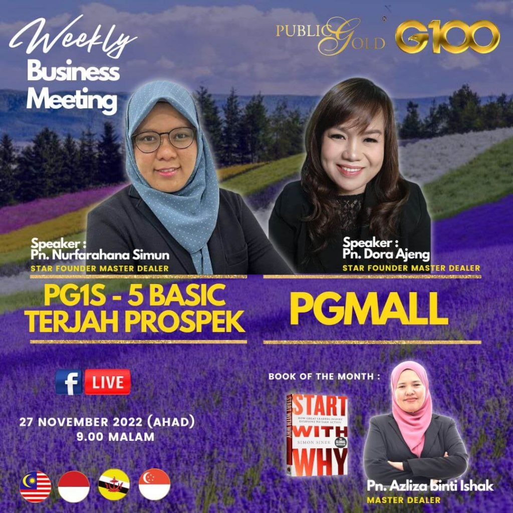 Peluang dapatkan input terkini, associate sesama team G100 yang positif, dan rungkaikan sebarang persoalan tentang bisnes setiap minggu supaya sentiasa bermotivasi.