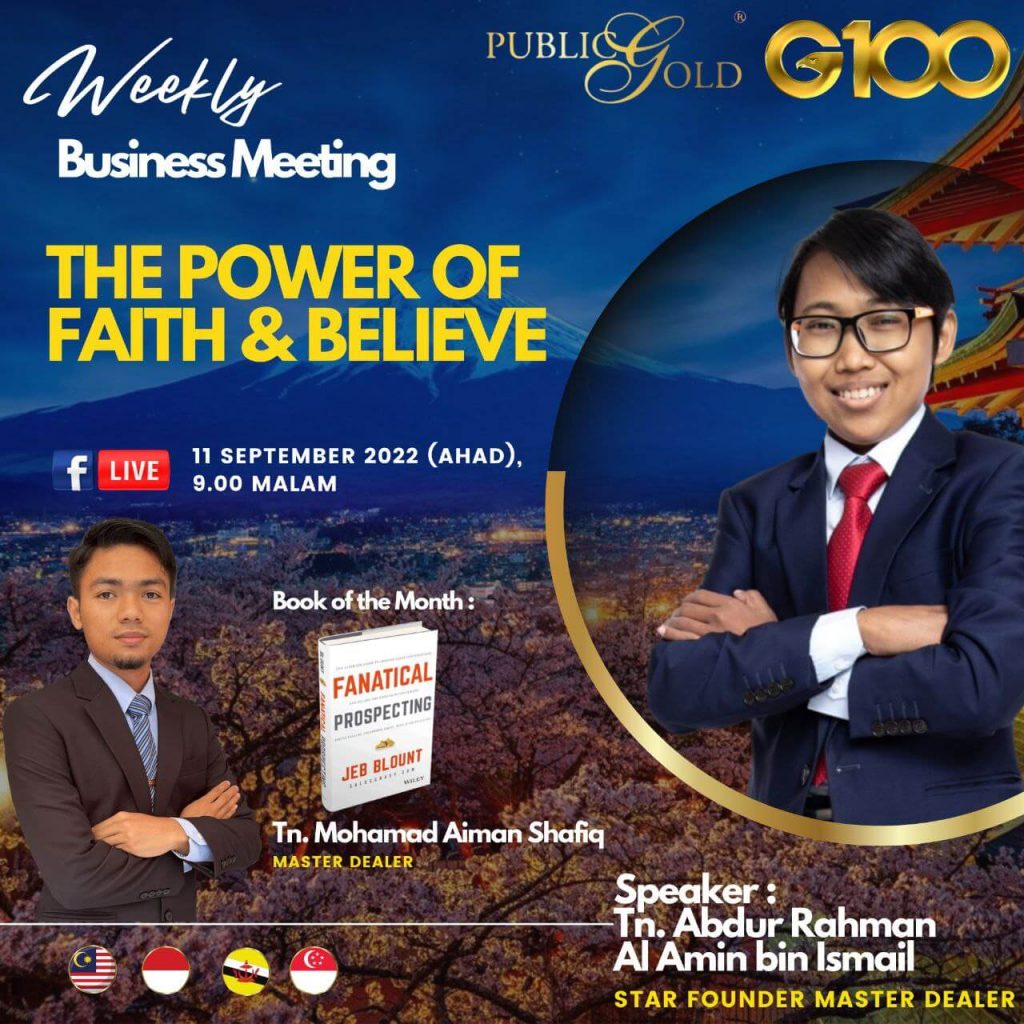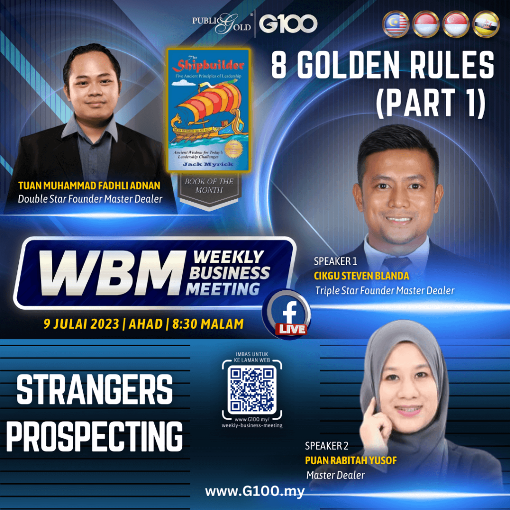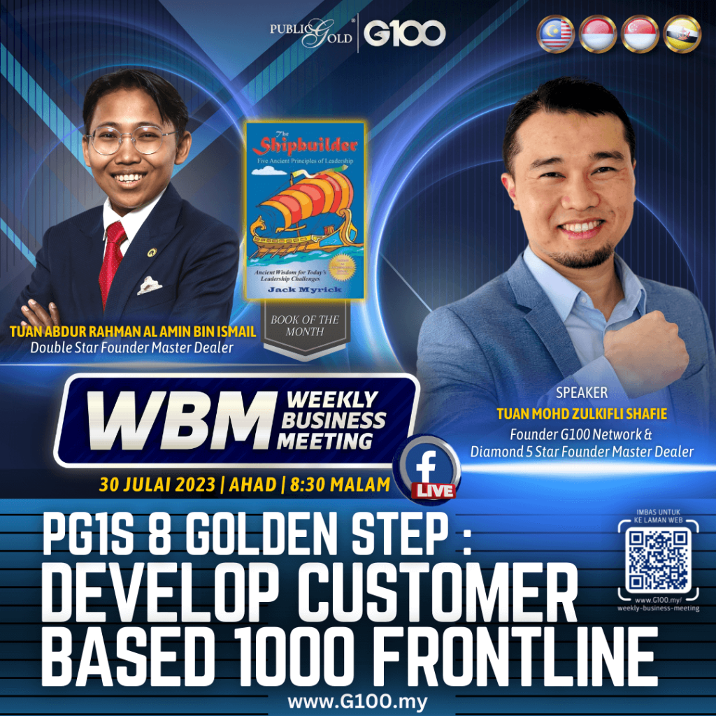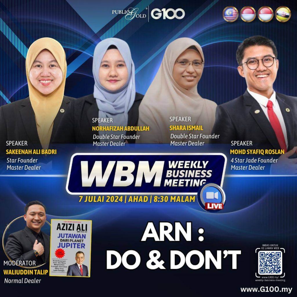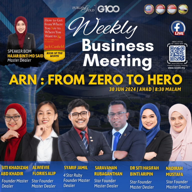 Anda tidak akan keseorangan. Dalam menggapai impian, anda pasti tempuhi pelbagai cabaran dan halangan. Selama 1 jam setiap minggu, G100 sediakan anda input-input terkini tentang bisnes, peluang bergaul sesama dealer yang positif, bahkan Founder Master Dealer yang sudah mempunyai proven result untuk merungkaikan sebarang persoalan anda dalam membina bisnes.