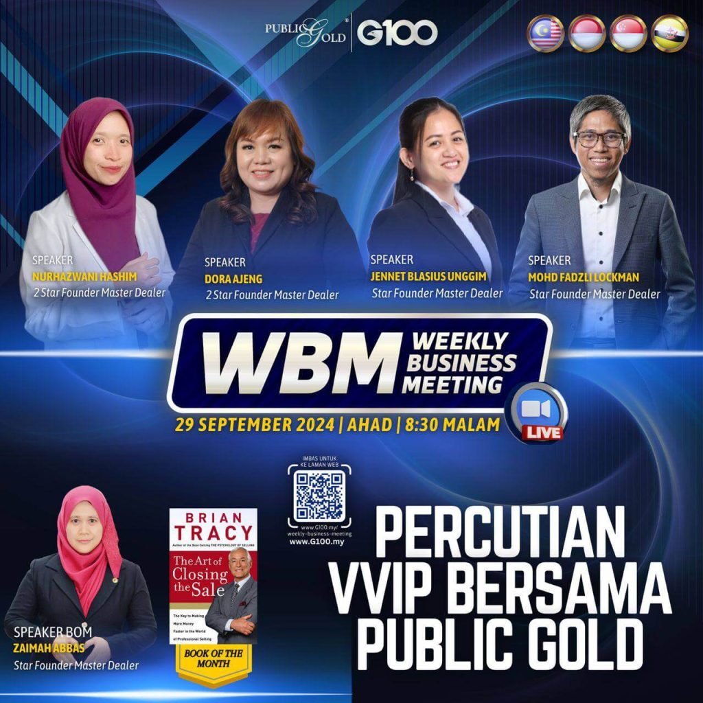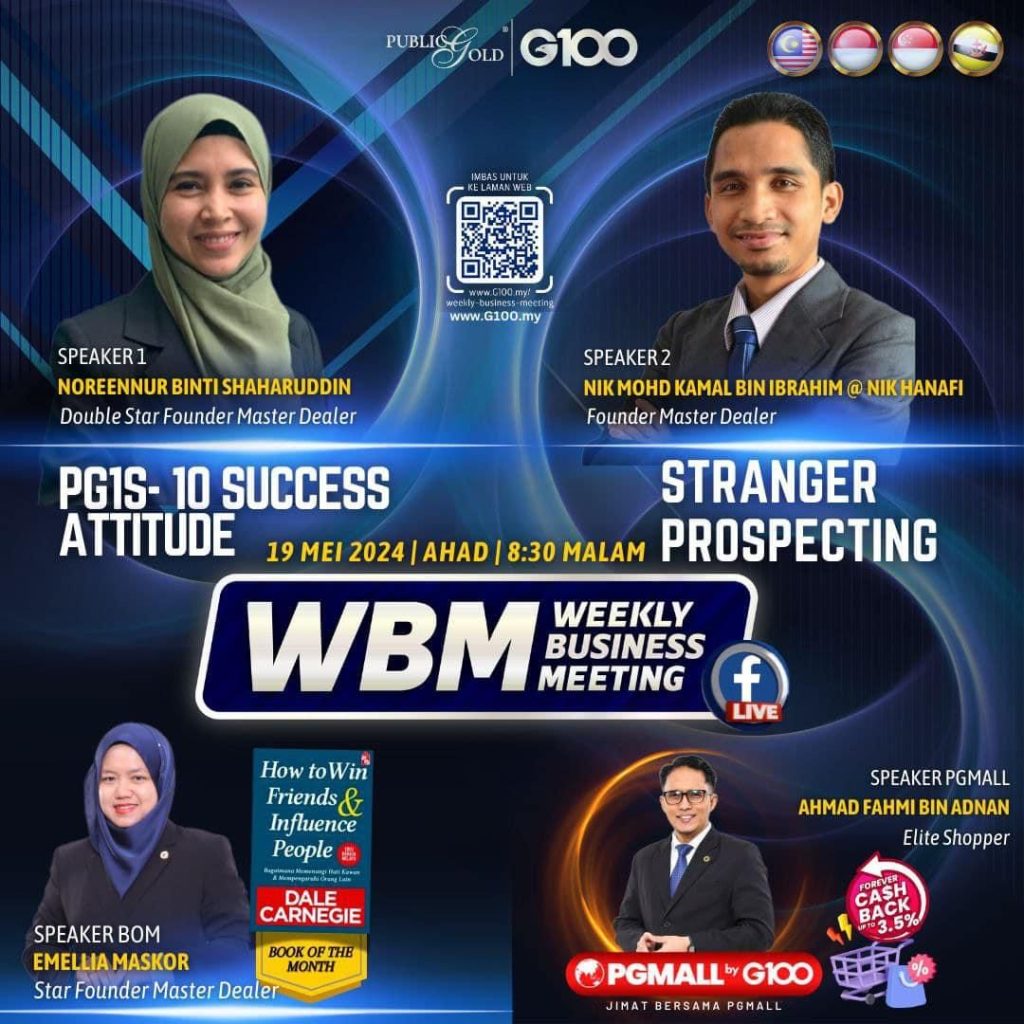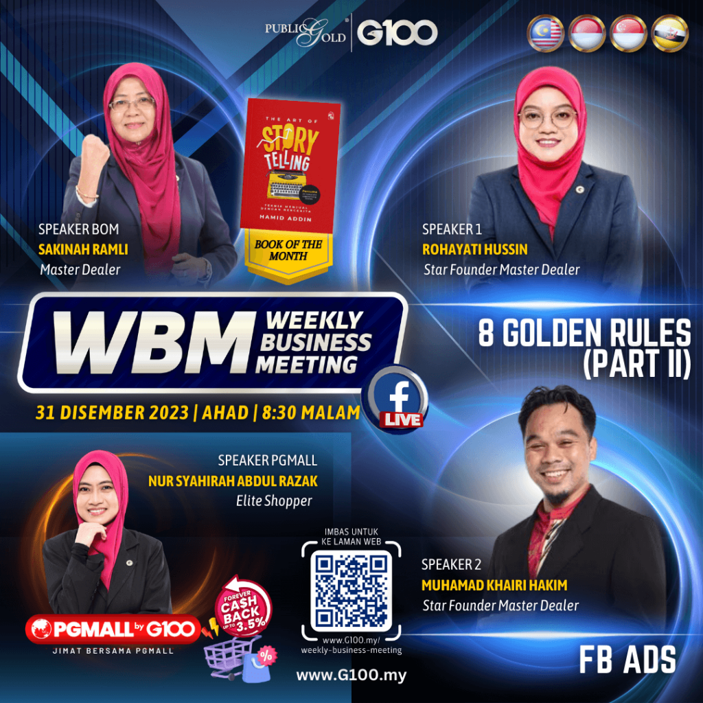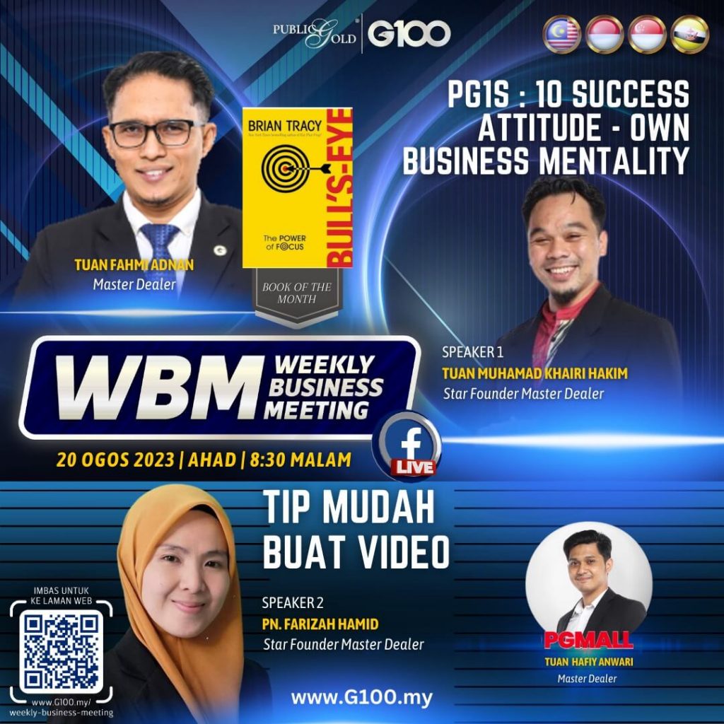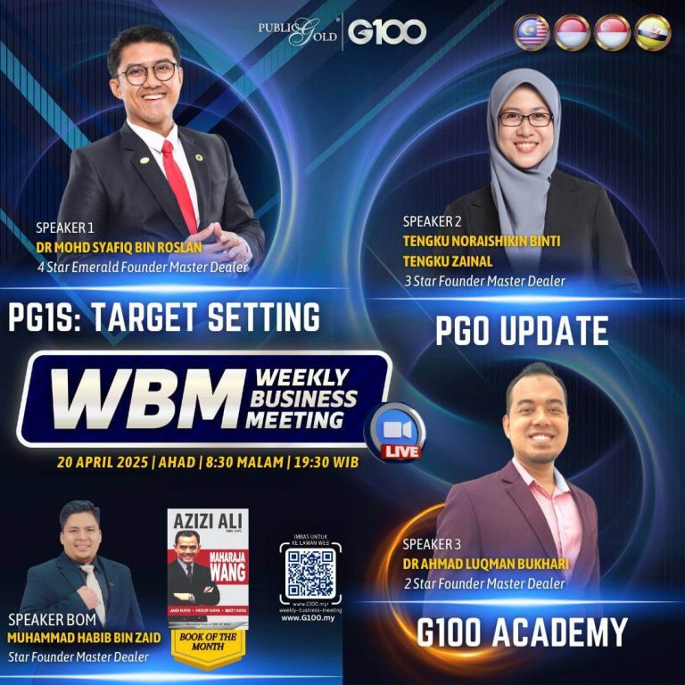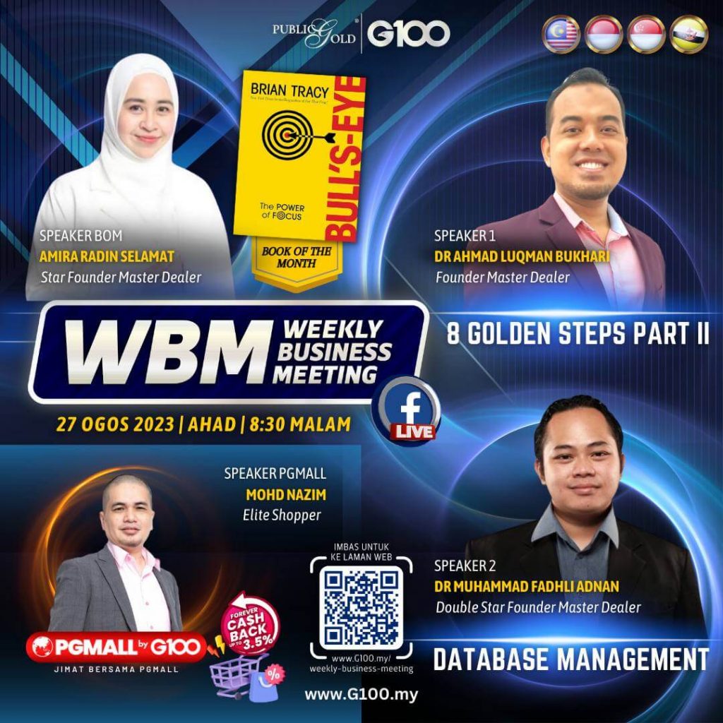 Weekly Business Meeting (WBM) yang diadakan setiap hari Ahad merupakan program latihan mingguan dalam bentuk perkongsian ilmu dan perkongsian update terkini tentang perkembangan bisnes Public Gold.