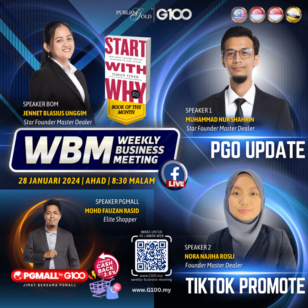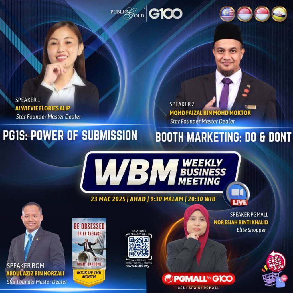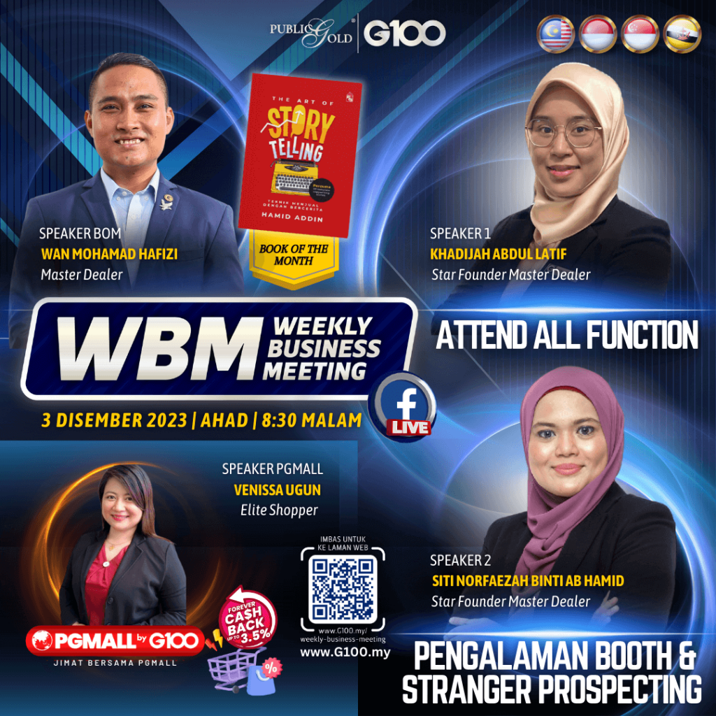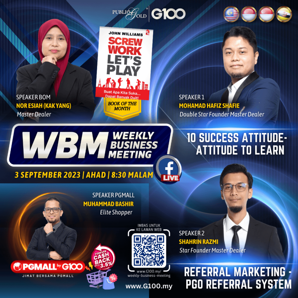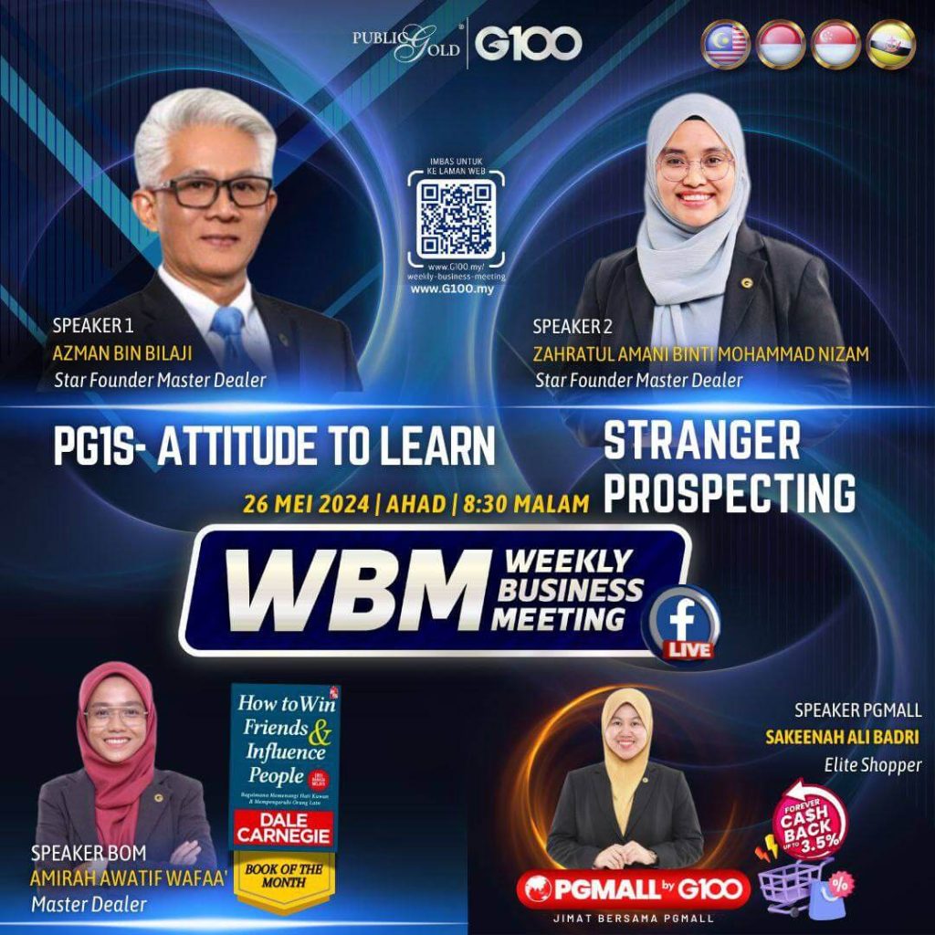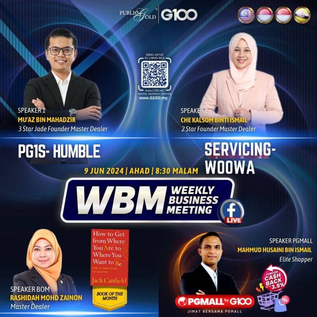 Weekly Business Meeting (WBM) yang diadakan setiap hari Ahad merupakan program latihan mingguan dalam bentuk perkongsian ilmu dan perkongsian update terkini tentang perkembangan bisnes Public Gold.
