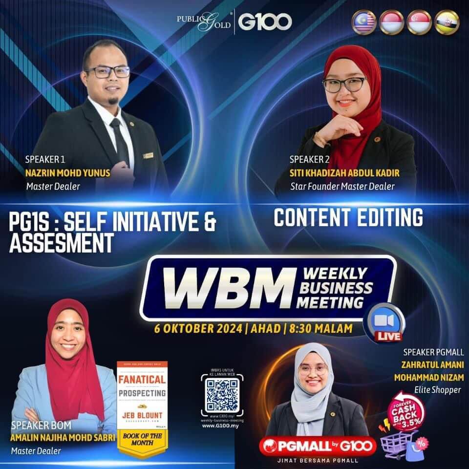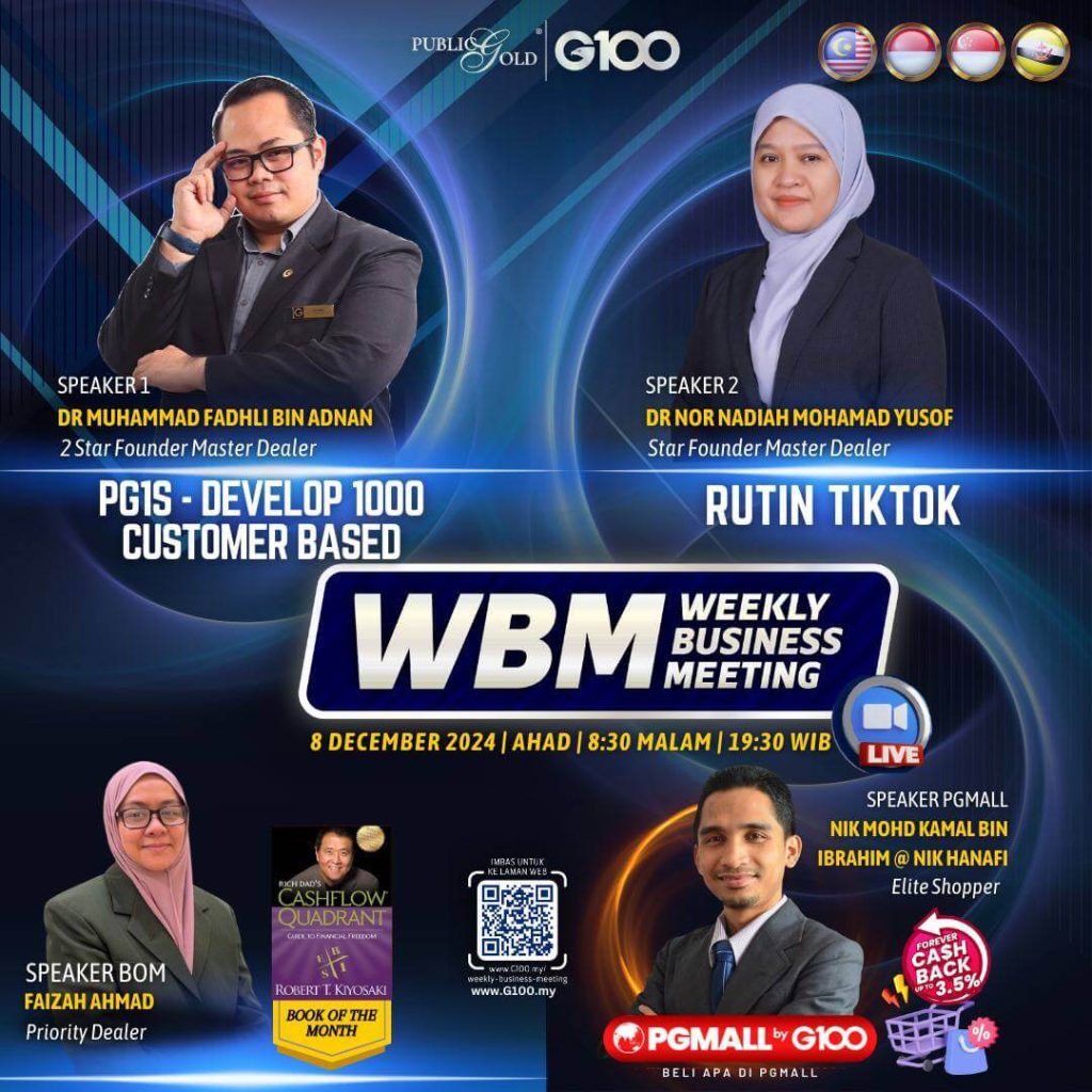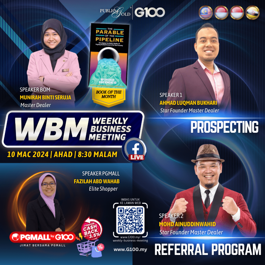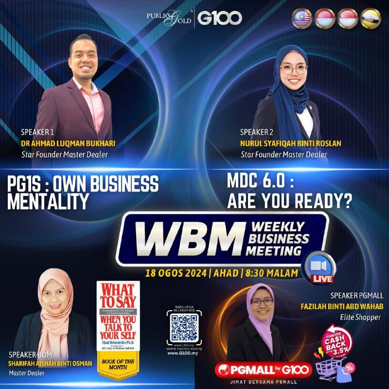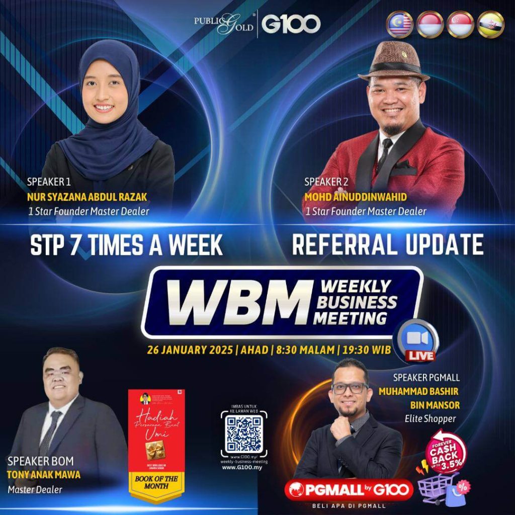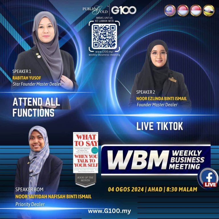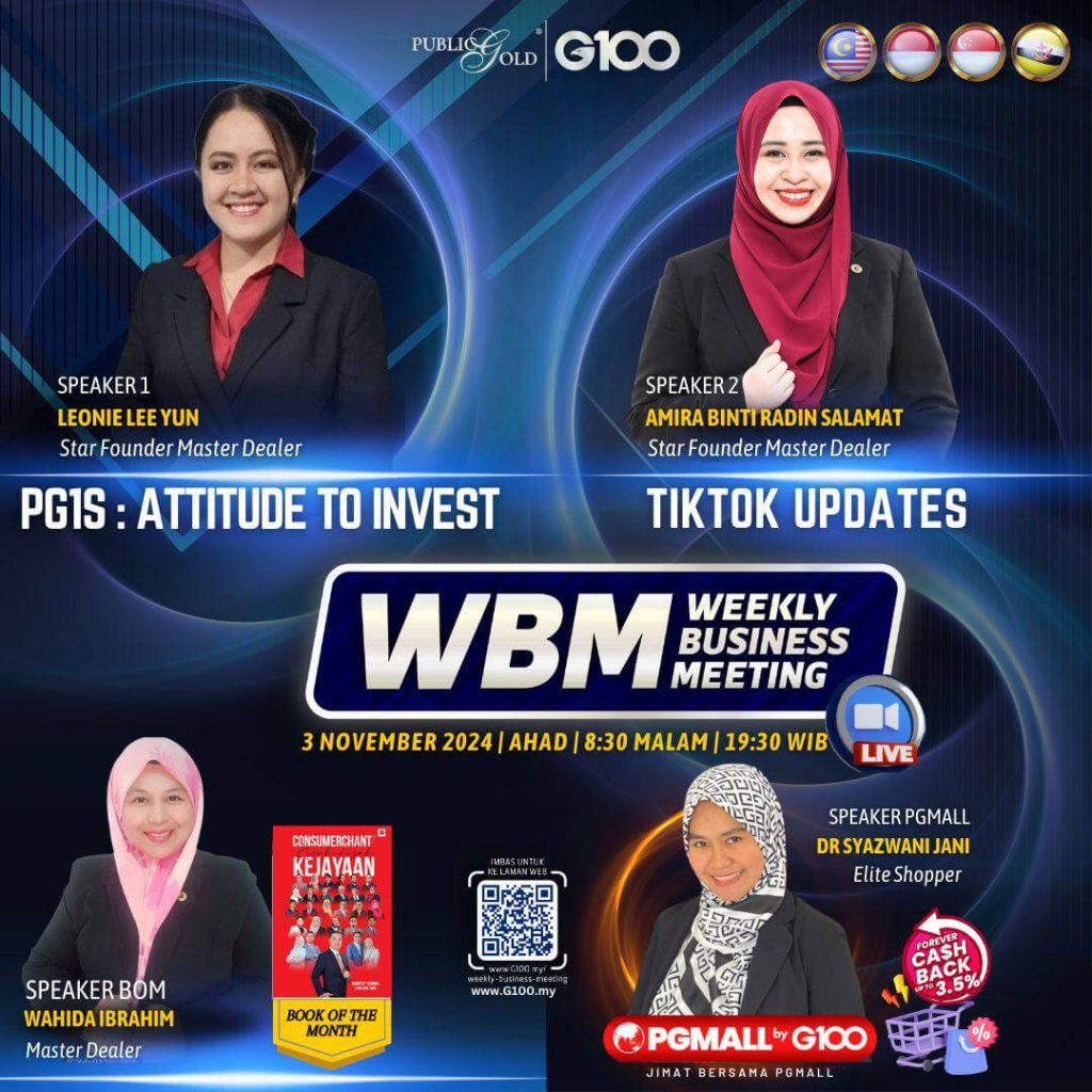 Weekly Business Meeting (WBM) yang diadakan setiap hari Ahad merupakan program latihan mingguan dalam bentuk perkongsian ilmu dan perkongsian update terkini tentang perkembangan bisnes Public Gold.