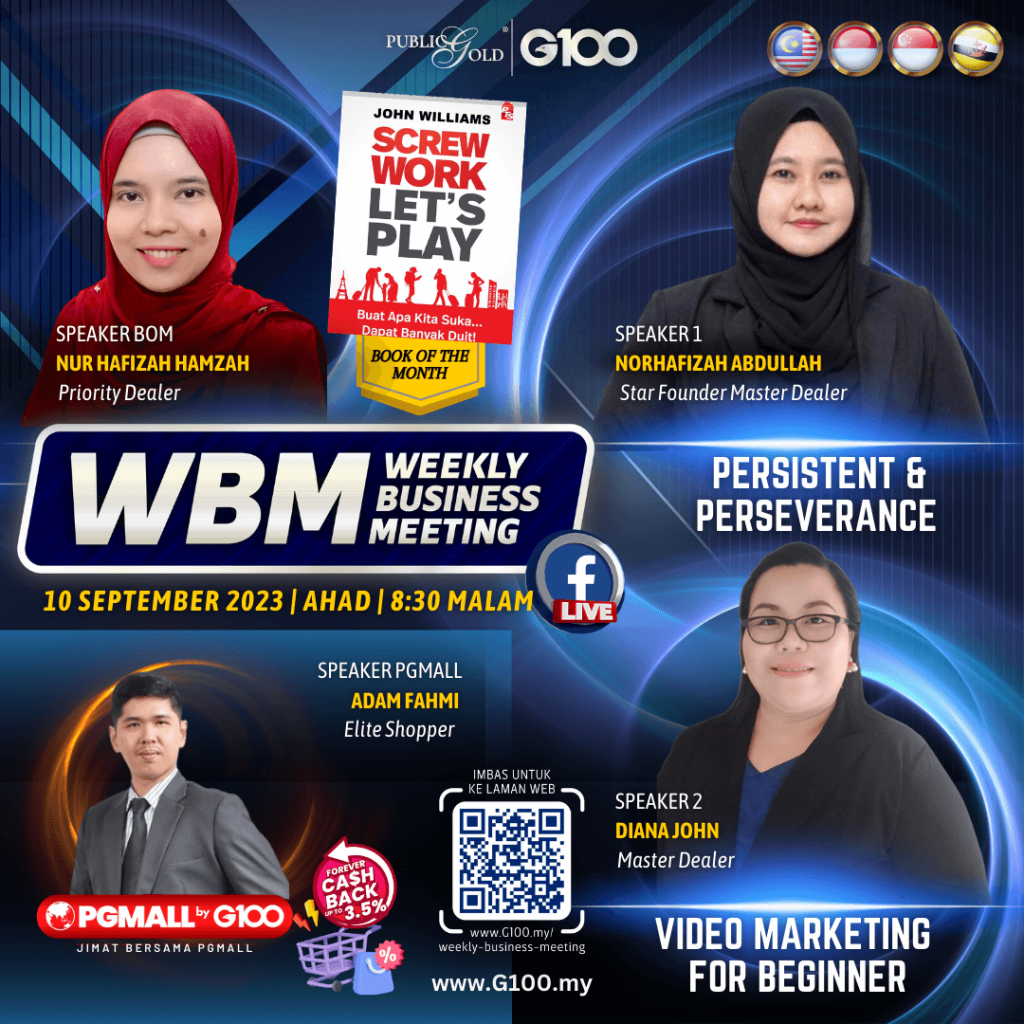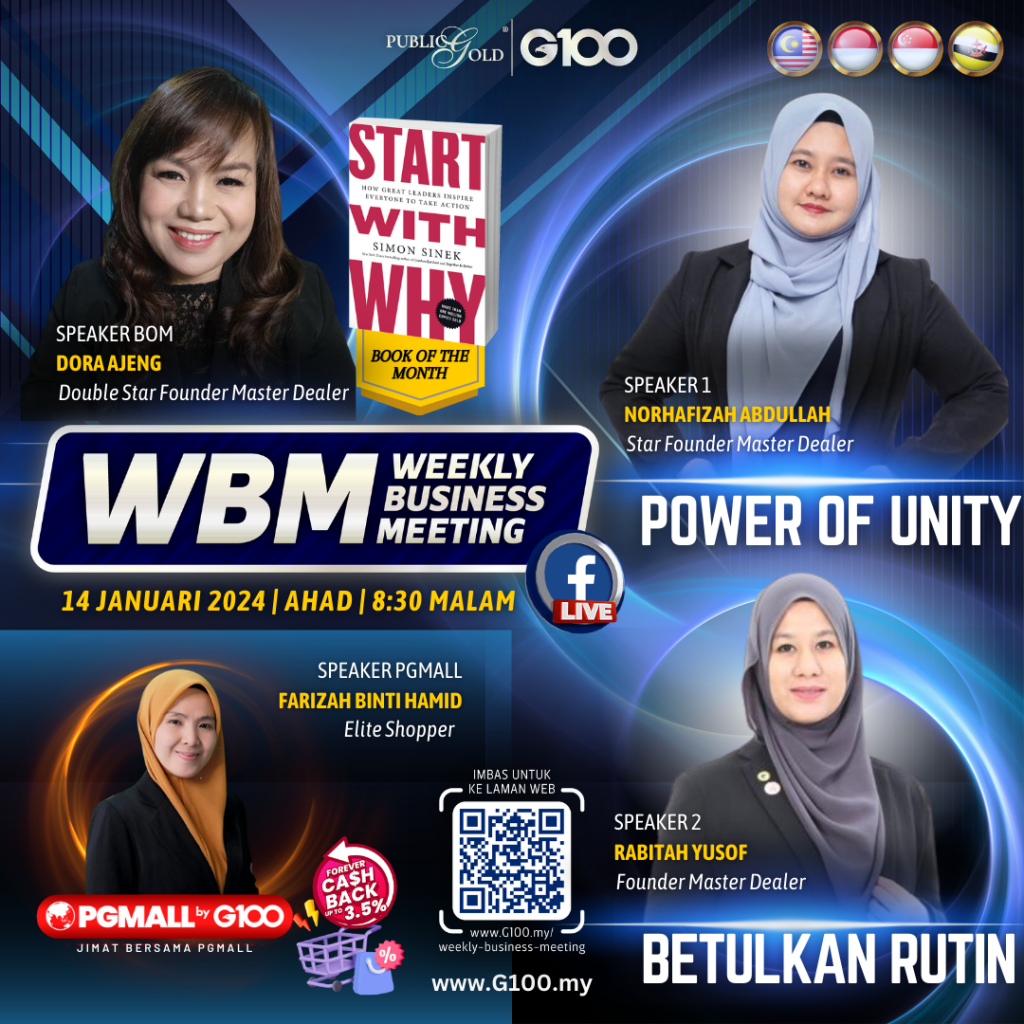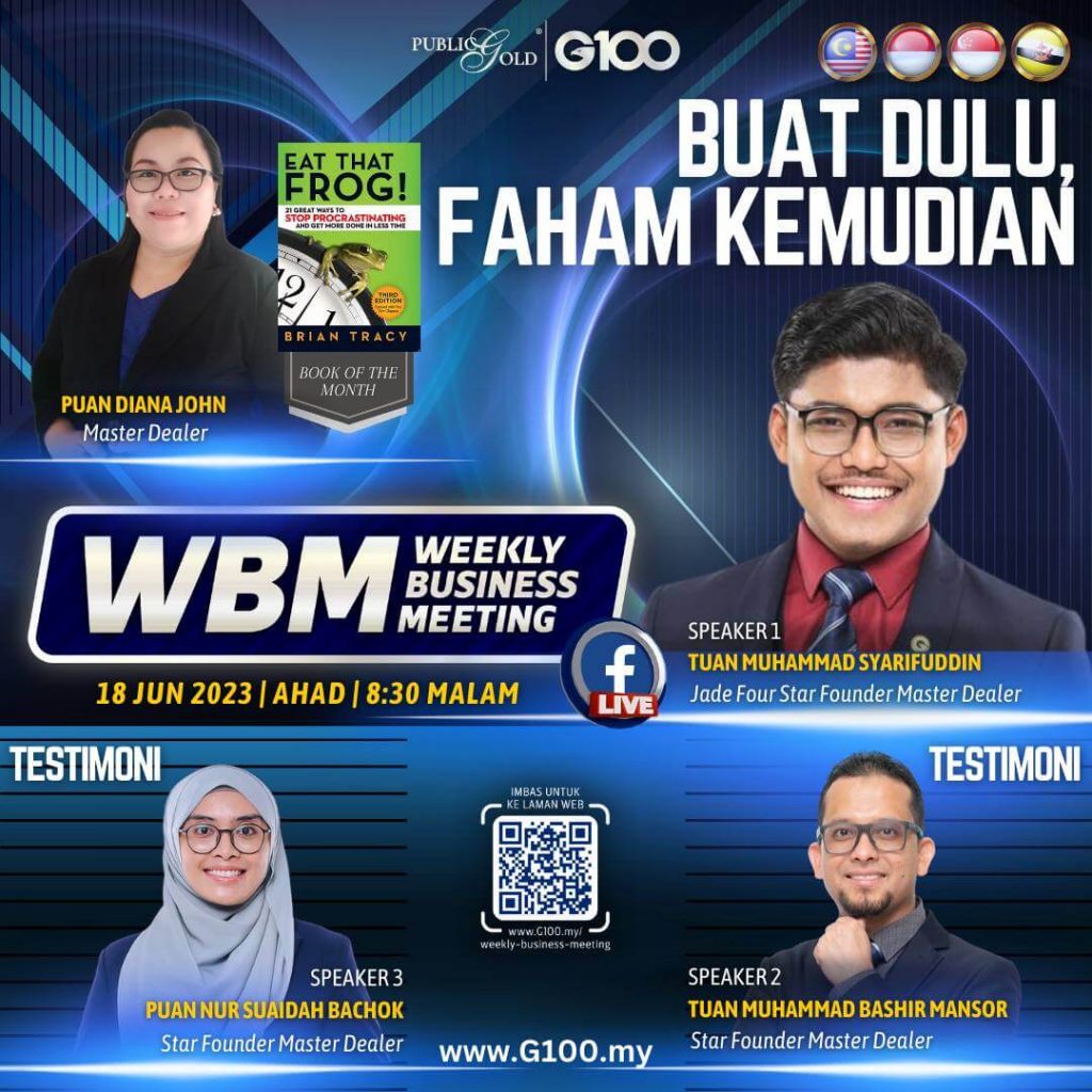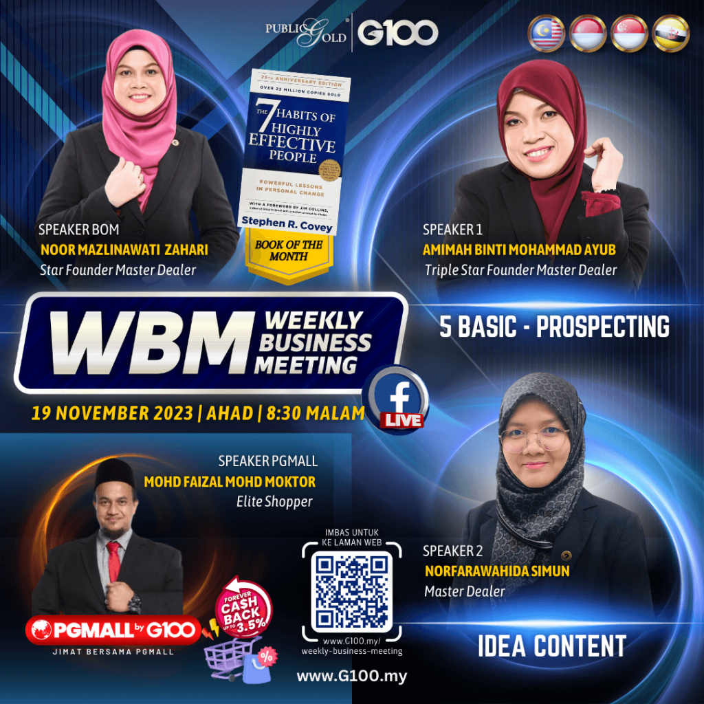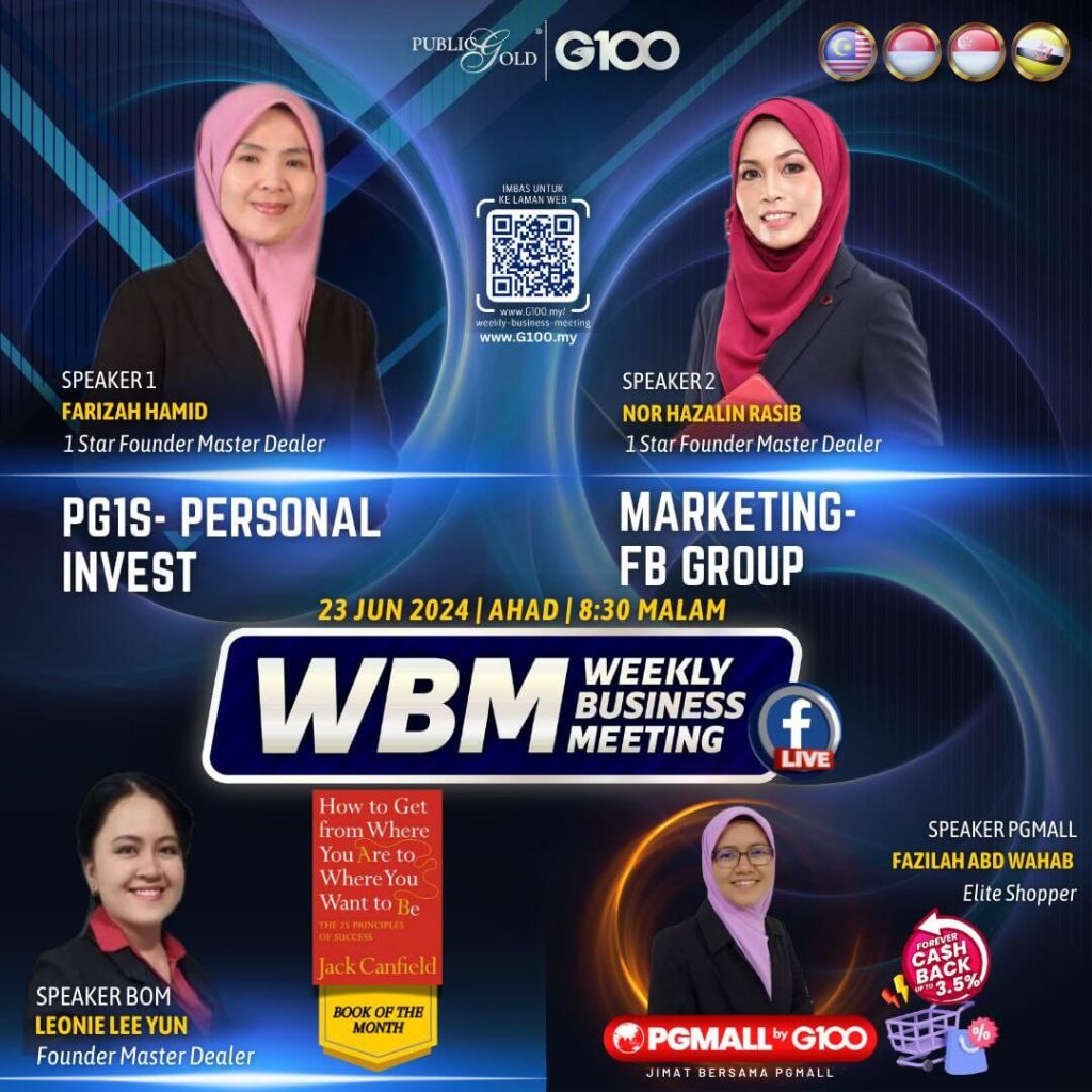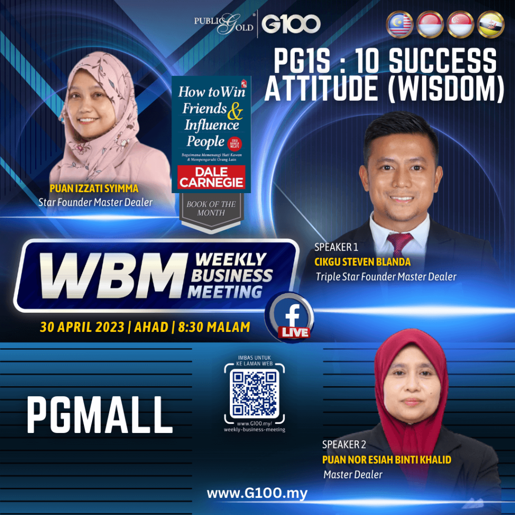 Weekly Business Meeting (WBM) yang diadakan setiap hari Ahad merupakan program latihan mingguan dalam bentuk perkongsian ilmu dan perkongsian update terkini tentang perkembangan bisnes Public Gold.
