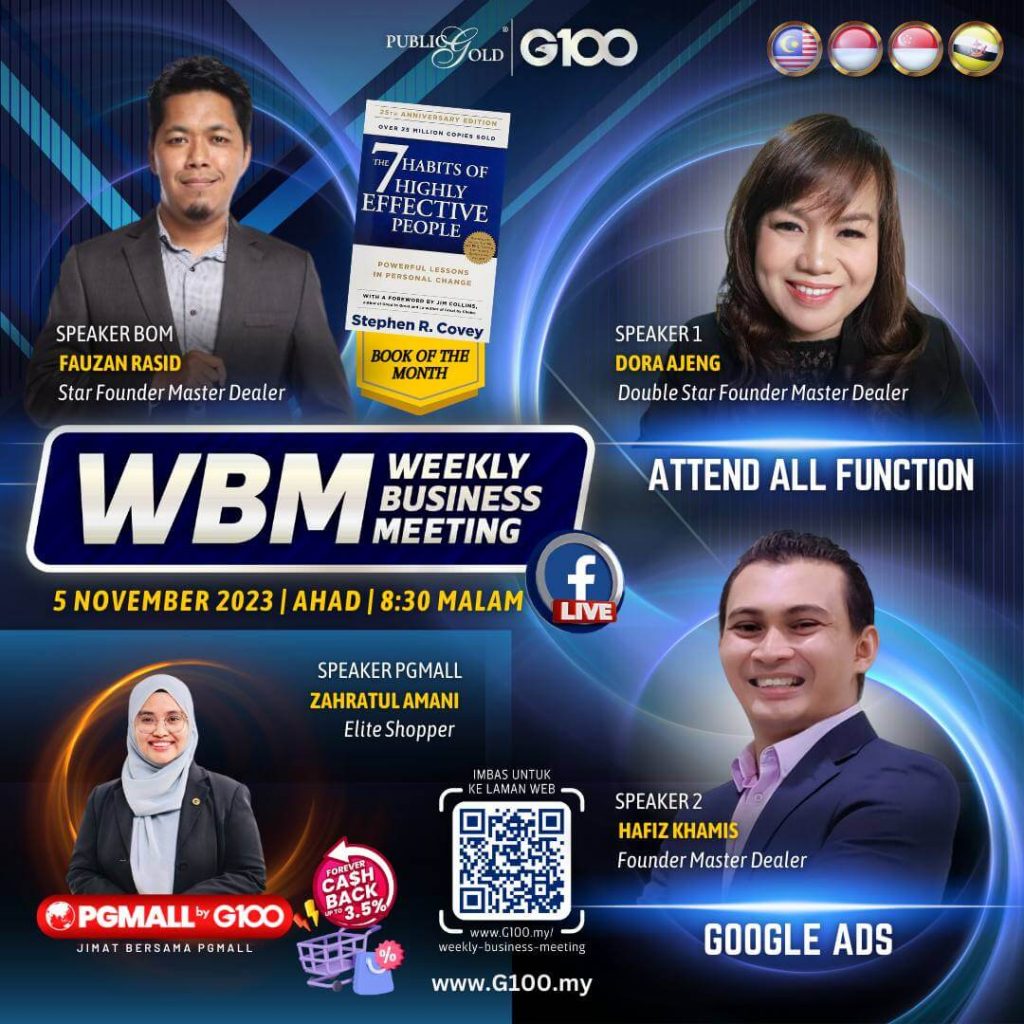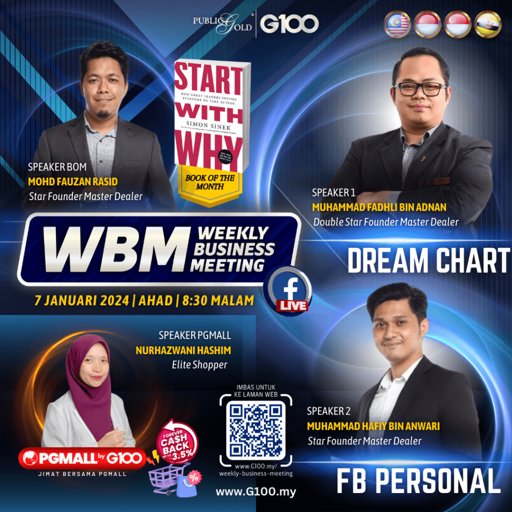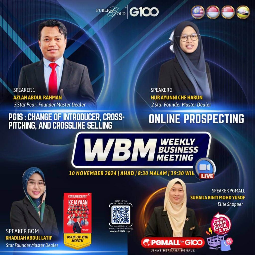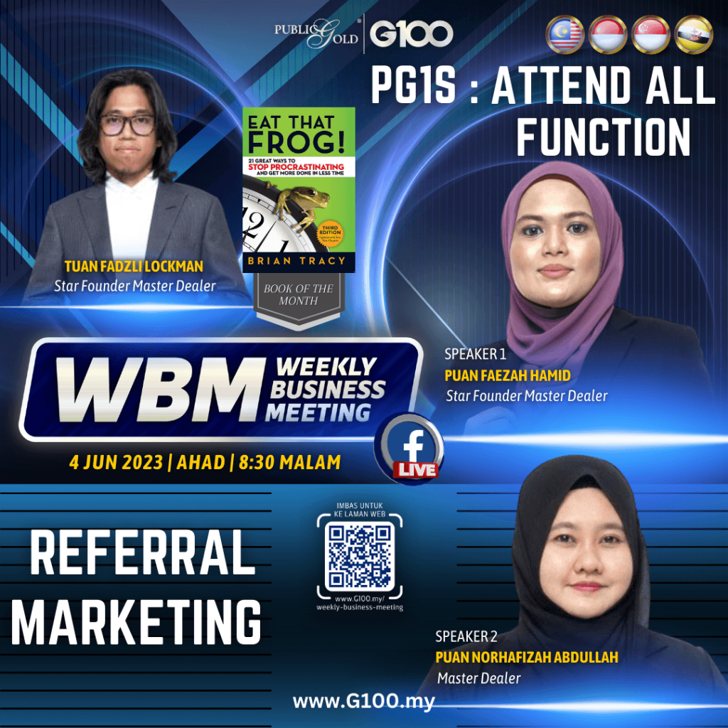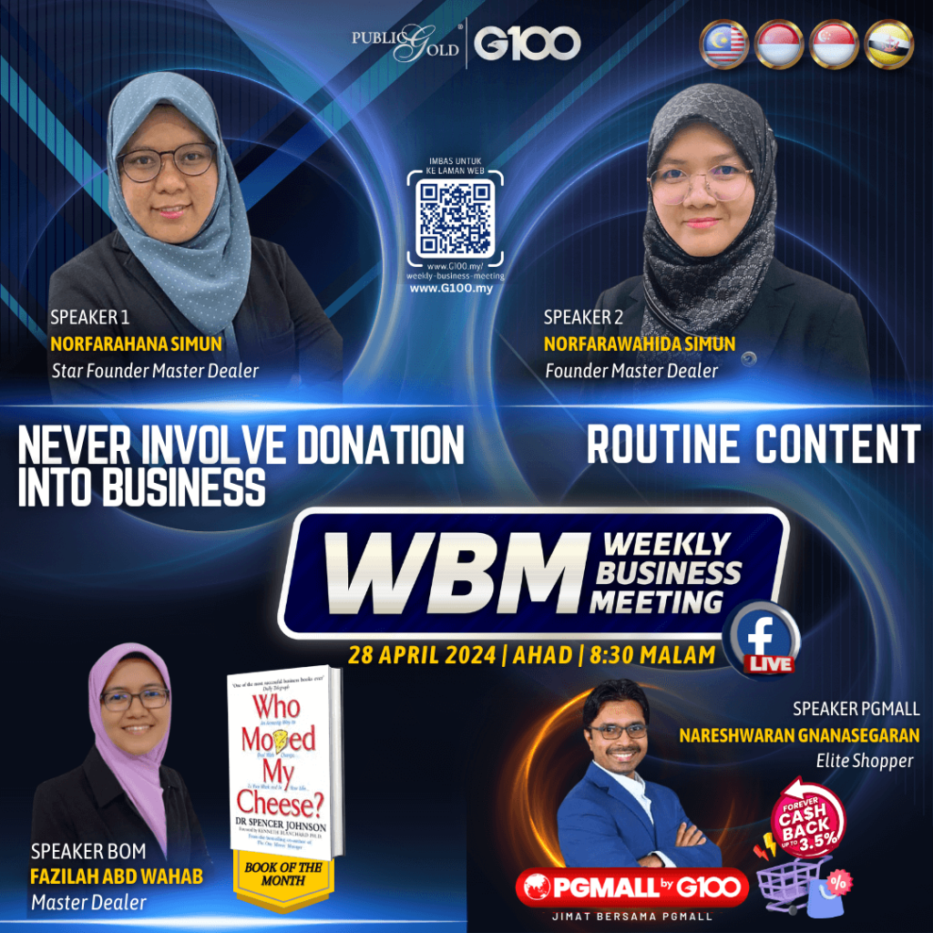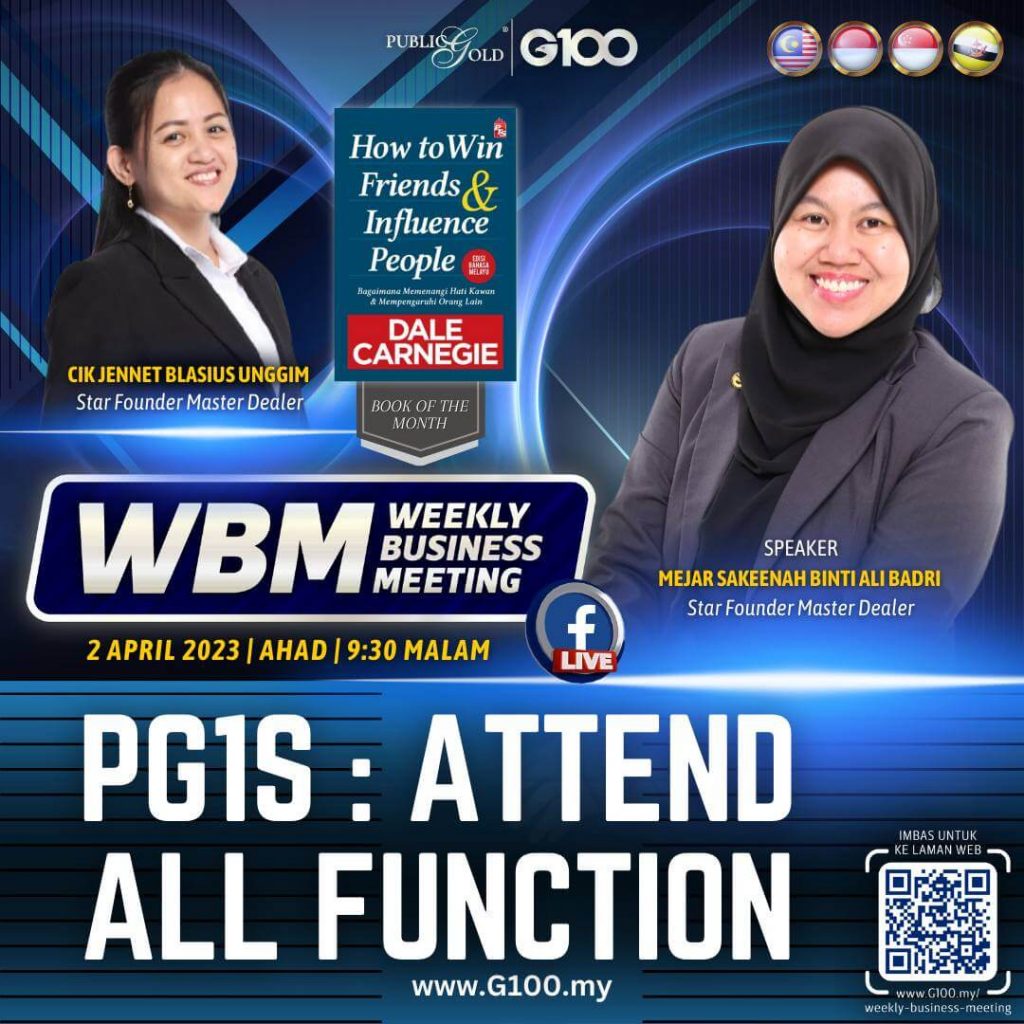 Weekly Business Meeting (WBM) yang diadakan setiap hari Ahad merupakan program latihan mingguan dalam bentuk perkongsian ilmu dan perkongsian update terkini tentang perkembangan bisnes Public Gold.